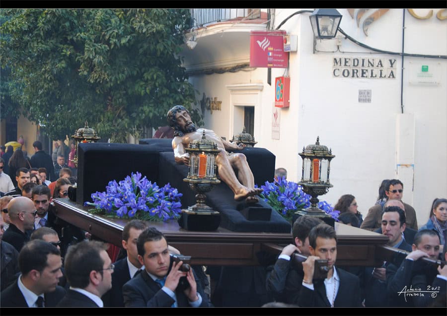 La Imagen iba colocada sobre una parihuela cedida para al ocasión por la Hermandad de los Dolores, así como los cuatro pequeños faroles que iluminaban las esquinas que fueron cedidos por la Hermandad de la Soledad. El exorno florar lo componía dos centros de iris morado a sendos lados de la Imagen del Cristo del Descendimiento.